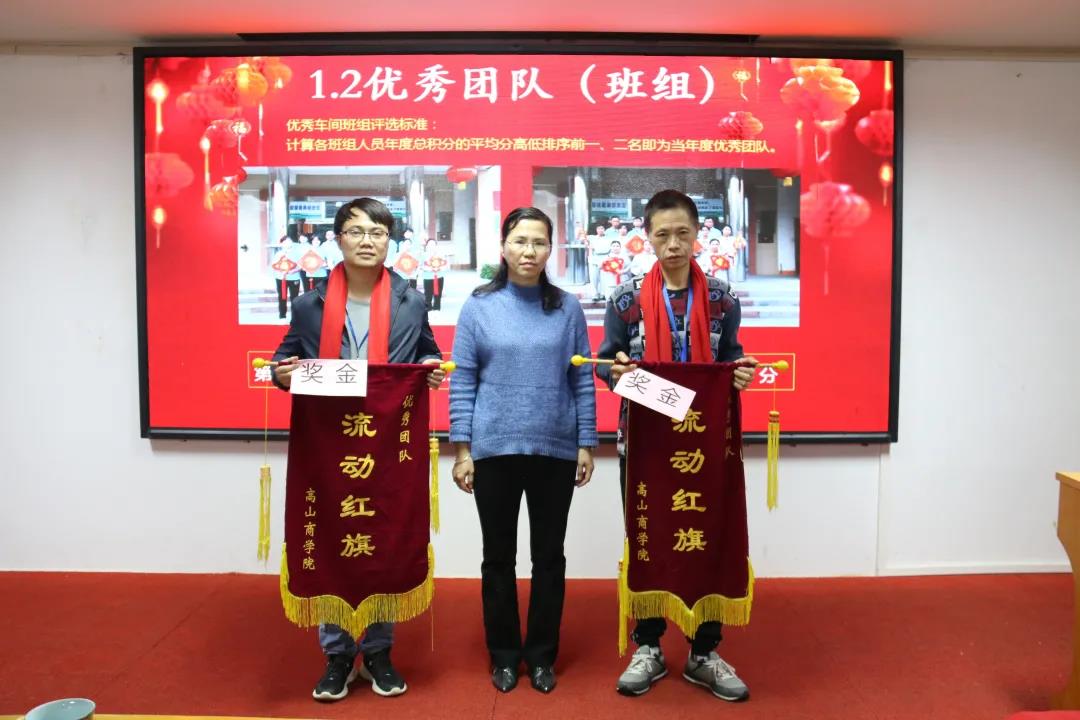 高山集團(tuán)副總經(jīng)理、東東蛋業(yè)總經(jīng)理黎來(lái)鳳為技術(shù)中心和中藥散劑車間頒發(fā)“優(yōu)秀團(tuán)隊(duì)”獎(jiǎng)