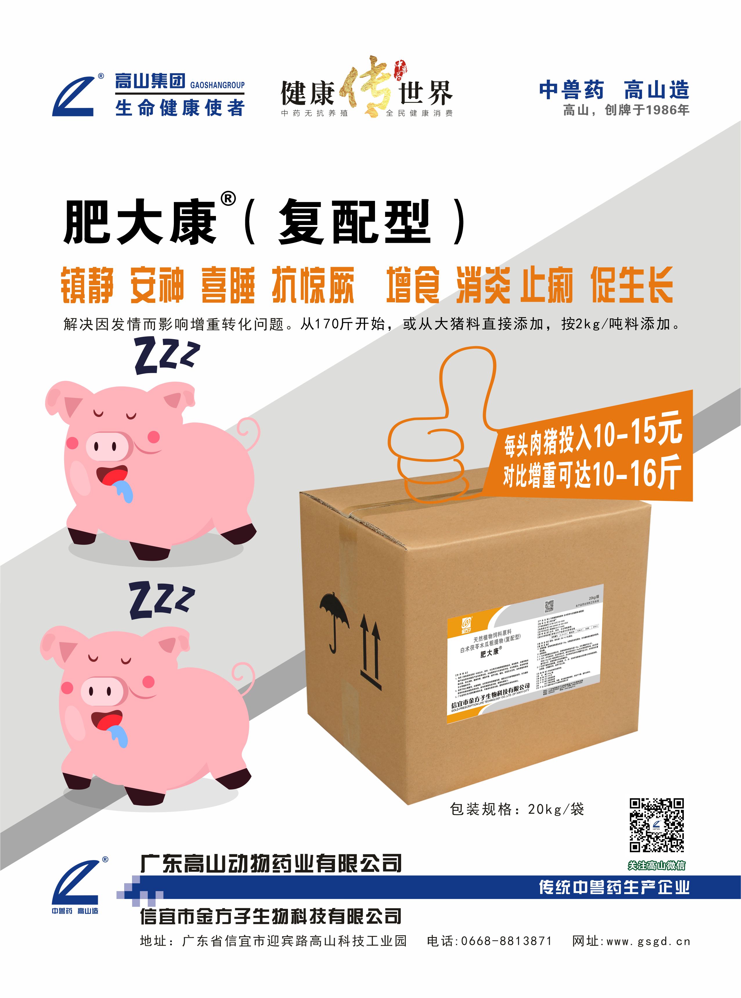 8、純中藥母豬發(fā)情與出欄前育肥增重保健。鎮(zhèn)靜,安神,喜睡,抗驚厥、增食,消炎,促生長,控制發(fā)情實現(xiàn)增重育肥,提高料肉比,改善肉的風味。使用肥大康從170斤開始,或從大豬料直接添加,按2kg/噸料至出欄?;驈?20斤體重豬添加1kg/噸料至出欄。