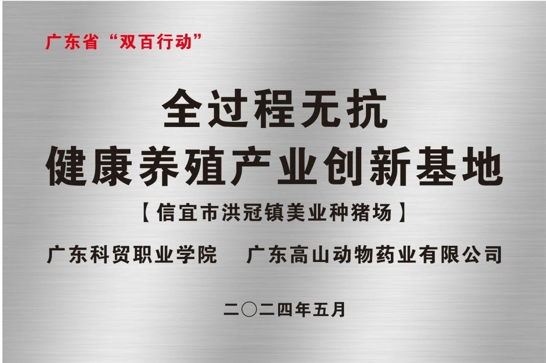 2024年5月24日,由廣東科貿職業(yè)學院與廣東高山動物藥業(yè)有限公司共同見證,在美業(yè)種豬場舉行了《全過程無抗健康養(yǎng)殖產業(yè)創(chuàng)新基地》示范場的掛牌授證儀式。掛牌授證儀式前,雙方進行了“無抗健康養(yǎng)殖”經驗與理念的深入交流。