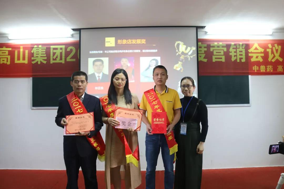 市場(chǎng)部經(jīng)理陳翠(右一)為2017年形象店發(fā)展獎(jiǎng)獲得者頒獎(jiǎng):林日良(左一)、葛乃春(左二)、黃芝幸(右二)