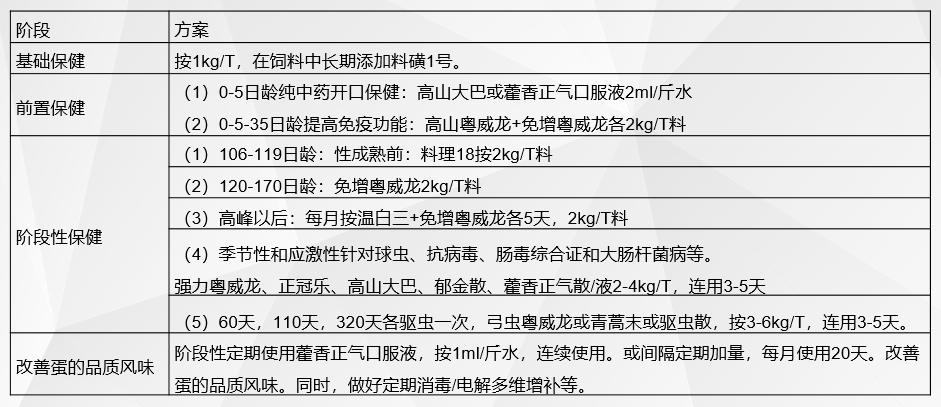 備注: 1、無抗方案成功與否取決于環(huán)境、免疫、管理三大基礎是否做到位。 2、預防:根據(jù)生理結構的變化和時令給予相對應的措施;天氣變化強力粵威龍2-4公斤/噸料進行預防;暑邪用正冠樂、驅(qū)蟲散。 3、輸卵管炎:臨床免增粵威龍+溫白三各2公斤/噸料,每月連用7天,免增粵威龍可以降低破蛋率。 4、蛋鴨無抗方案按上述所有產(chǎn)品的用量增加30%;鴿子的用量和鴨子相同;種用(種雞和種鴨)在產(chǎn)蛋前按上表方案不變,產(chǎn)蛋后用量增加50%。 | ||