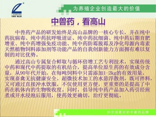 高山,從1986年創(chuàng)牌,走過30年,始終堅(jiān)持走中獸藥著名品牌的發(fā)展道路。從純中藥治療,到純中藥預(yù)防,到中草藥保健,解除畜禽亞健康,提高生產(chǎn)性能,改善肉的品質(zhì),實(shí)現(xiàn)畜禽的自然健康生長 ,實(shí)現(xiàn)中藥無抗健康養(yǎng)殖。