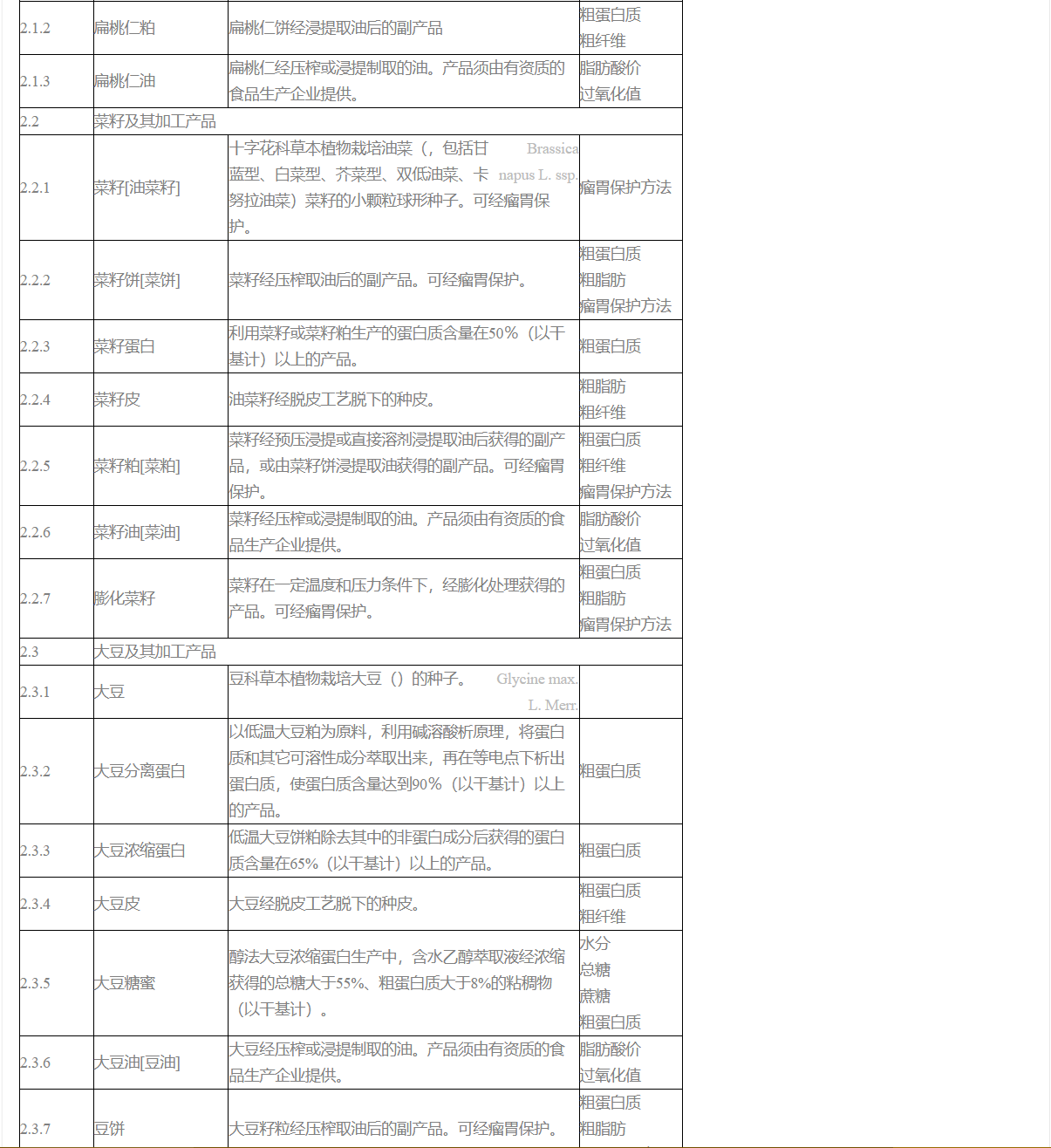 2. 菜籽粕、菜籽蛋白、大豆糖蜜、大豆分離蛋白、大豆?jié)饪s蛋白、豆粕、膨化豆粕、膨化大豆蛋白[大豆組織蛋白]、花生粕[花生仁粕]、花生蛋白、棉籽粕、棉籽蛋白