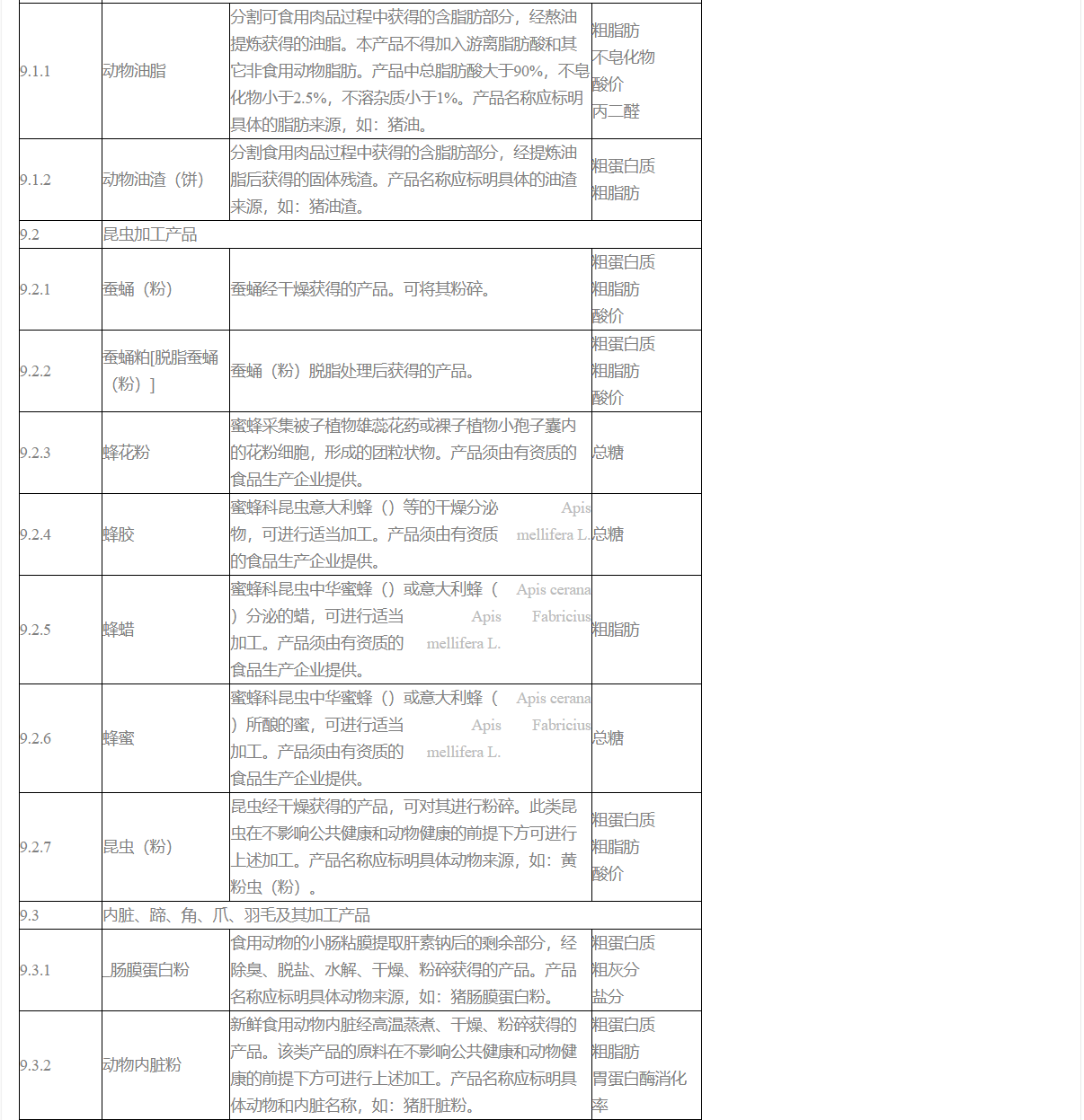 4. 肉粉、肉骨粉、骨粉(粒)、酸化骨粉、脫膠骨粉、明膠、骨膠原蛋白、動(dòng)物內(nèi)臟粉、禽爪皮粉、水解蹄角粉、腸膜蛋白粉、膨化羽毛粉、水解羽毛粉、水解畜毛粉、血粉、水解血粉、噴霧干燥血漿蛋白粉、噴霧干燥血球蛋白粉、水解血球蛋白粉、水解珠蛋白粉、血紅素蛋白粉、蛋粉、蛋黃粉、蛋清粉、蛋殼粉、動(dòng)物油脂、動(dòng)物油渣(粉)、