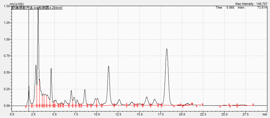 藿香正氣口服液依據(jù)《中國(guó)獸藥典》2015年版二部生產(chǎn),配方中含有厚樸,在其建議生產(chǎn)工藝中厚樸的提取方法是采用60%乙醇加熱回流1小時(shí)。經(jīng)研究總結(jié),廣東高山技術(shù)創(chuàng)新中心對(duì)厚樸提取工藝采取多級(jí)循環(huán)蒸餾提取,以及醇和水提結(jié)合,能充分將其有效成分和有用成份提取出來,所得的有效成分比原標(biāo)準(zhǔn)工藝多,而且有效成分含量高(見附圖1、附圖2液相色譜圖),有用成份膏體更多,產(chǎn)品的臨床效果比原生產(chǎn)工藝更好?!暗赖兀ㄋ幉漠a(chǎn)地)+鮮?。ㄞ较悖?厚樸提取工藝改進(jìn)”,致其所制得的藿香正氣口服液的效果也更好更獨(dú)特。
