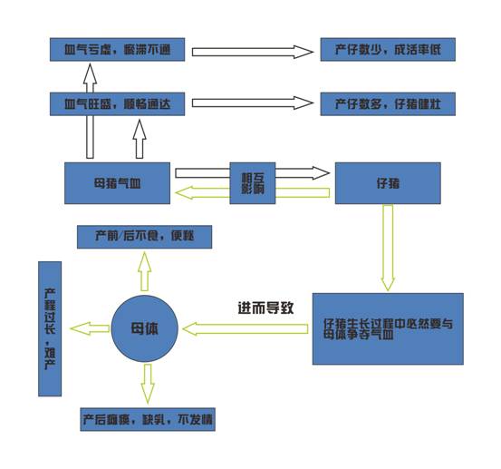 母豬分娩后,若氣血旺盛、順暢調(diào)達(dá),乳汁分泌便足,仔豬吃得飽、長(zhǎng)得快。但實(shí)踐當(dāng)中并不如此。母豬的氣血與仔豬是相互影響的,如果母豬自身氣血旺盛,順暢調(diào)達(dá),則產(chǎn)仔數(shù)多,仔豬健壯。如果母豬氣血虧虛,甚至瘀滯不通,則產(chǎn)仔數(shù)少,仔豬成活率低。但仔豬在母豬懷孕和斷奶之前必然要與母體爭(zhēng)奪氣血,進(jìn)而導(dǎo)致母體氣血不足的加重。
