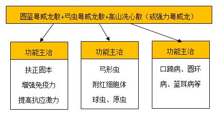 3、日常使用楊樹花口服液或四逆湯進行替抗腸道預(yù)防保健。臨床高死亡時,聯(lián)合強力粵威龍散各2-4kg/噸料使用。