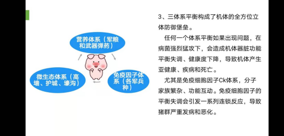 賀教授在國內(nèi)首創(chuàng)動物生命“三體系平衡”理論,且形成了成熟的“三體平衡”理論體系:指豬的生命機體與生命健康是由三大重要的生命平衡體系保障和支撐,即營養(yǎng)體系平衡+微生態(tài)體系平衡+免疫細胞因子體系平衡,它們之間分工協(xié)作、相互支撐,猶如“三足鼎立”。任何一個體系平衡出現(xiàn)問題,都會造成機體器臟功能平衡失調(diào)和健康度下降,導(dǎo)致機體產(chǎn)生亞健康、疾病和死亡。