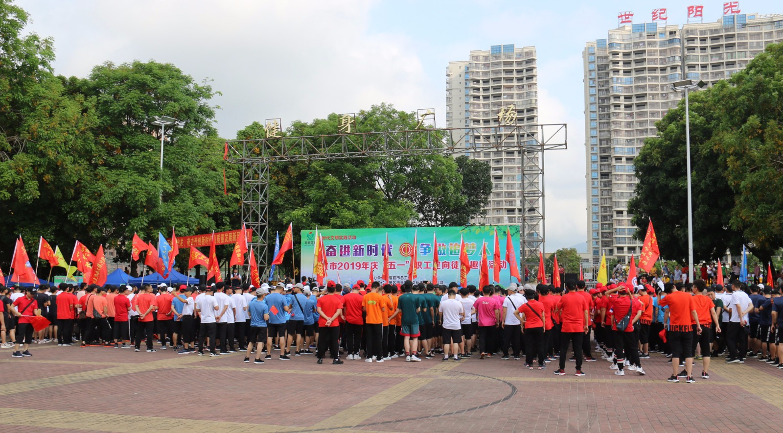 2019年4月23日信宜市紹秀體育中心一片歡聲雷動,熱鬧非凡,值“五一”國際勞動節(jié)來臨之際由信宜市總工會組織市直機關(guān)單位及各基層工會代表開展主題為《奮進新時代·爭做追夢人——凝聚筑夢力量·建設(shè)美麗信宜》信宜市2019年慶“五一”定向徒步趣味活動,全市職工工會代表共62支隊伍1200多人參加活動。高山工會19名職工代表參加了本次活動,活動中高山隊員們精神抖擻,朝氣蓬勃,積極響應(yīng)“奮進新時代,爭做追夢人”精神,展示友愛高山、活力高山、銳軍高山。