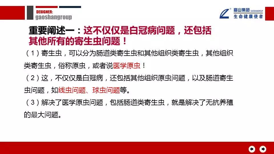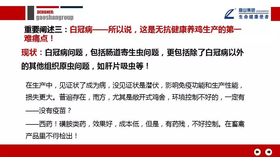 彭激夫教授的報(bào)告指出,中藥無抗健康養(yǎng)殖理念隨高山而來,高山從90年代開始堅(jiān)持中獸藥治療、預(yù)防和保健的中藥大健康理念,喉炎凈、強(qiáng)力粵威龍、正冠樂等經(jīng)典產(chǎn)品,歷經(jīng)三十年市場(chǎng)而經(jīng)久不衰。我們要因應(yīng)行業(yè)發(fā)展趨勢(shì)和養(yǎng)殖企業(yè)對(duì)環(huán)境重視程度的變化,構(gòu)建畜牧人命運(yùn)共同體,并始終以健康作為前提。報(bào)告分別針對(duì)蛋雞、豬的最大影響因素和非洲豬瘟帶來的機(jī)會(huì)等進(jìn)行了深度闡述。