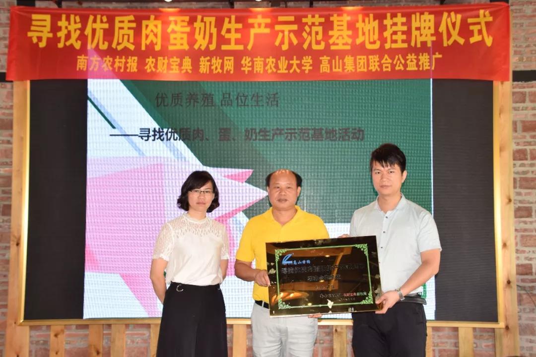 2018年7月12日,南方農(nóng)村報(bào)、《農(nóng)財(cái)寶典》和新牧網(wǎng)、華南農(nóng)業(yè)大學(xué)聯(lián)合高山集團(tuán)共同推廣“尋找優(yōu)質(zhì)肉蛋奶生產(chǎn)示范基地”全國(guó)公益活動(dòng)第二站在以“食為鮮”著稱的廣府開平市“合民生鮮”農(nóng)莊隆重舉行掛牌儀式。