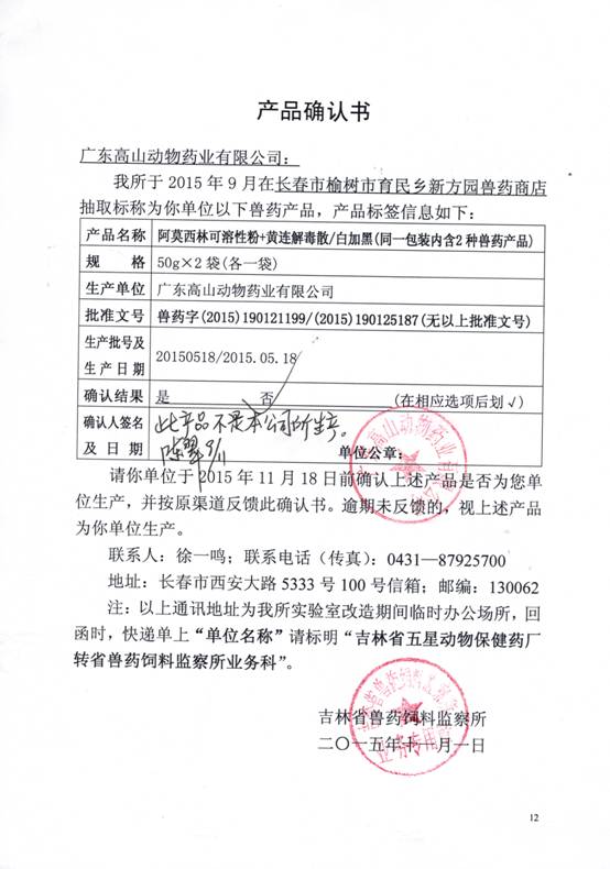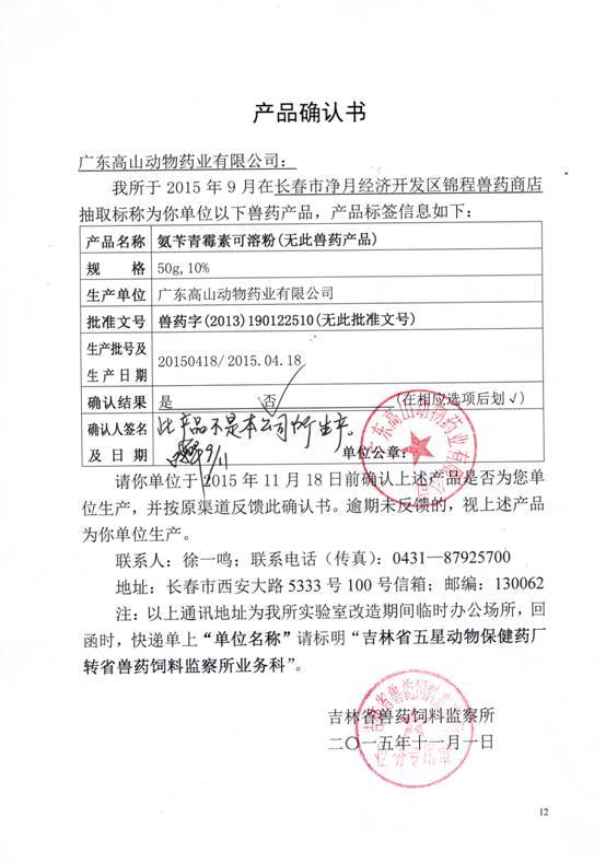 二、近期在吉林省被抽檢的“氨芐青霉素可溶粉(無此獸藥產(chǎn)品)”、“阿莫西林可溶性粉+黃連解毒散/白加黑(同一包裝內(nèi)含2種獸藥產(chǎn)品)”并非公司生產(chǎn),該抽檢產(chǎn)品為假冒產(chǎn)品,現(xiàn)向廣大消費者溫馨提示:廣東高山動物藥業(yè)有限公司的產(chǎn)品擁有公司專有的、統(tǒng)一的、規(guī)范的包裝視覺系統(tǒng),以及產(chǎn)品代碼和防偽電話系統(tǒng),公司的業(yè)務人員均佩戴有公司的工作證和公司徽章。擁有公司合法的、完整的、正規(guī)的銷售渠道和網(wǎng)絡,敬請廣大消費者從公司直管的各省區(qū)渠道進貨,并認準廣東高山動物藥業(yè)有限公司的產(chǎn)品,謹防上當受騙。廣東高山動物藥業(yè)有限公司是高新技術(shù)企業(yè)、廣東省誠信示范企業(yè)、同時擁有兩個廣東省著名商標,接受名牌商標保護。假冒產(chǎn)品是嚴重違反獸藥管理條例和商標保護相關(guān)法律法規(guī)的違法行為。公司保留對下述假冒產(chǎn)品銷售行為的進一步追究權(quán)利。