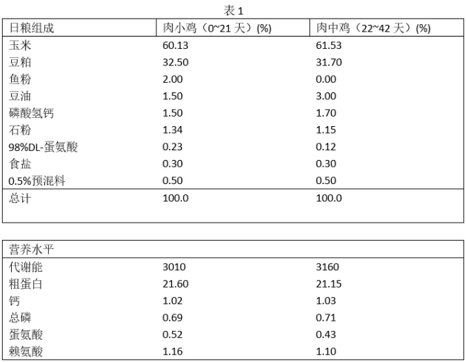 試驗(yàn)分為肉小雞(0-21天)和肉中雞(22-42)天兩個(gè)階段。試驗(yàn)雞籠養(yǎng),飼喂干粉狀飼料,自由采食和飲水,每天24h光照,溫度控制在34℃-35℃,每周下降2℃,最終溫度控制在20℃-26℃,相對濕度45%-55%。基礎(chǔ)日糧營養(yǎng)水平參考中華人民共和國農(nóng)業(yè)行業(yè)標(biāo)準(zhǔn)配合而成,其組成及營養(yǎng)水平(見表1)試驗(yàn)期間記錄采食量,21d和42d稱體重。計(jì)算平均日采食量、平均日增重量和耗料重比。