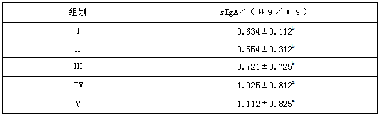 由表4可知,25d時(shí),Ⅰ、Ⅱ、Ⅲ組之間母仔雞腸道分泌免疫球蛋白sIgA無顯著差異(P>0.05);IV、V組母仔雞腸道分泌免疫球蛋白sIgA顯著高于Ⅰ、Ⅱ、Ⅲ組(P<0.05)。
