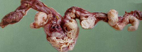 剖檢可見輸卵管充血、腫脹,嚴(yán)重的呈深紅色或暗紅色,局部高度擴(kuò)張,管壁變薄,內(nèi)有黃、白色膿樣分必物,黏膜有出血點(diǎn);卵泡數(shù)目減少,卵泡變形,卵巢變形,卵巢萎縮,腸系發(fā)生炎癥,致使腸與腸以及其他臟器相互粘連。
