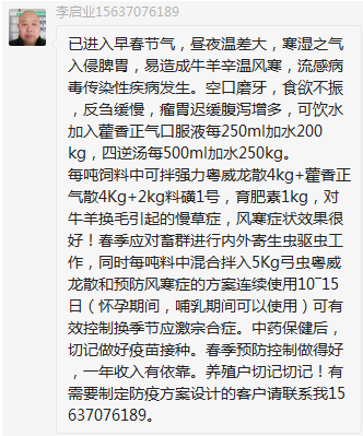 二、早春節(jié)氣,晝夜溫差大,寒濕之氣入侵脾胃,易造成牛羊辛溫風(fēng)寒,流感病毒傳染性疾病發(fā)生。空口磨牙,食欲不振,反芻緩慢,瘤胃遲緩腹瀉增多,可飲水加入藿香正氣口服液每250ml加水200kg,四逆湯每500ml加水250kg,連用7-10天。