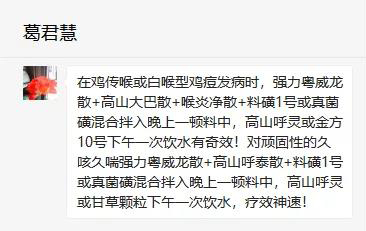 葛老師說:高山強(qiáng)力粵威龍散可以說是高山產(chǎn)品的魂,掌握了其用法用量可以說是舉一反三,收事半功倍之神效!又有靶向引導(dǎo)作用,將治療性藥物有效成分引到病灶部,同時(shí)起增效擴(kuò)效作用,不論何種疾病、證侯。不論畜禽都可以廣泛使用而不受季節(jié)、氣候影響。現(xiàn)根據(jù)體會(huì)總結(jié)如下:一是具有抗病毒作用,當(dāng)在生產(chǎn)中3g1斤料用時(shí),抗病毒活性強(qiáng)大!二是抗菌作用,與高山大巴使用時(shí),對(duì)沙門氏菌、卵黃性腹膜炎、鼻炎菌及副嗜血桿菌、鏈球菌有強(qiáng)大的殺滅作用!在寄生蟲病治療及預(yù)防上,如用到強(qiáng)力粵威龍散,療效好而快!所以葛老師的體會(huì)是只要用到強(qiáng)力粵威龍散病就好了一半,就從大戰(zhàn)略上占了先機(jī),希望大家認(rèn)真透徹理解,如果用好高山強(qiáng)力粵威龍散,對(duì)高山產(chǎn)品的銷量能增加50%,所以對(duì)強(qiáng)力粵威龍散的藥用原理及方劑要認(rèn)識(shí)透,才能增強(qiáng)用強(qiáng)力粵威龍散的主觀能動(dòng)性!高山藥使用16年體會(huì),僅供參考。